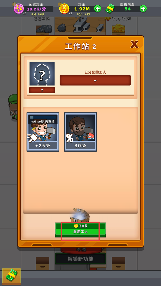 1、点击花费金币按钮,解锁新的工作站,拓展生产规模。