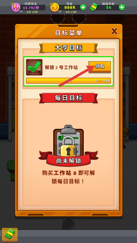 3、点击【领取】按钮,领取解锁2号工作站的金币奖励。
