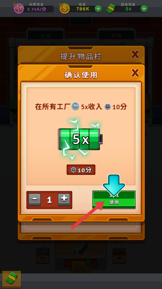 2、在提升物品栏,点击【使用】按钮,使用道具,提升收益。