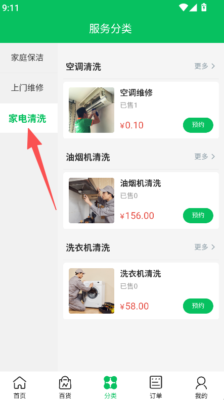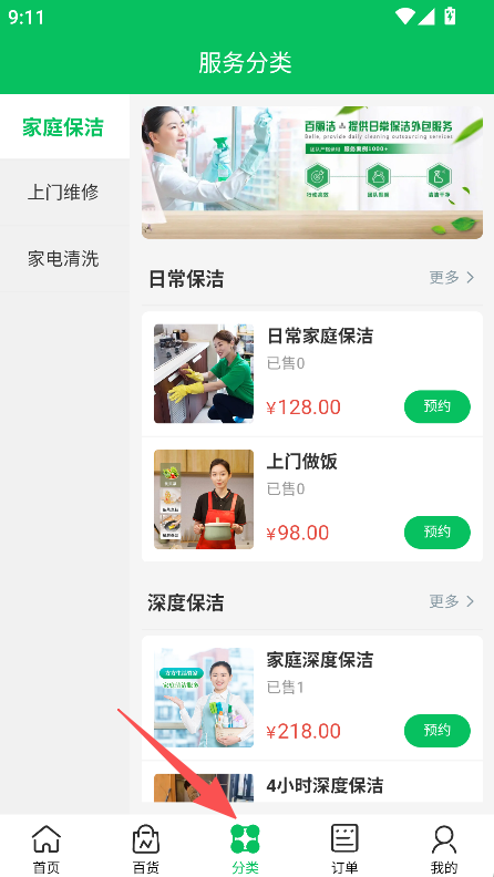 1、进入分类板块,选择服务分类(如家庭保洁、家电清洗)。