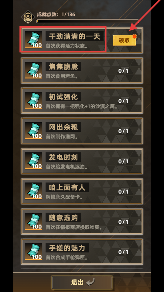 1、完成活力状态任务后,领取【干劲满满的一天】成就奖励,获100资源助力末日生存发展。
