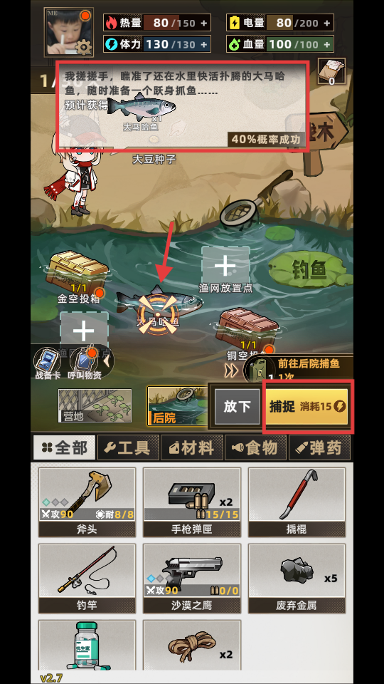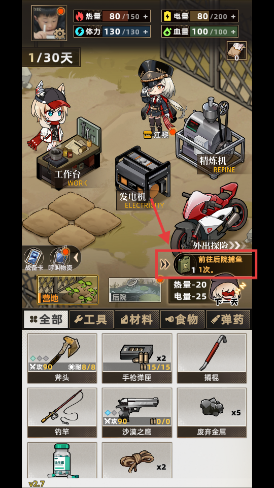 2、营地点击【前往后院捕鱼】,消耗热量与电量获取食物,合理规划捕鱼次数保资源。