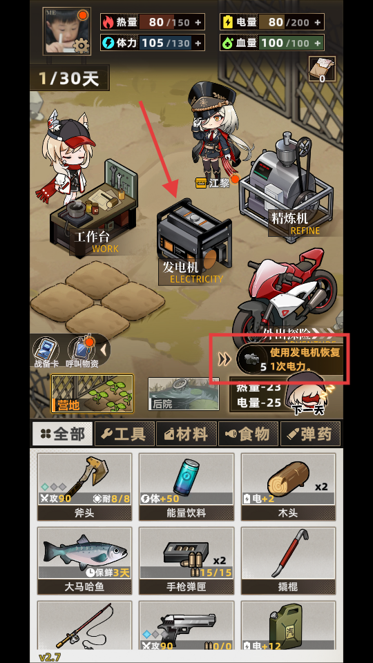 4、电量不足时,使用发电机【使用发电机恢复电力】,利用5次机会保障营地电力供应。