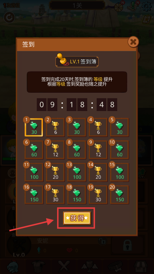 1、签到界面点击【获得】领奖励,累计20天升级签到簿,等级提升奖励更优。