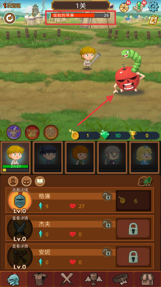 2、1关挑战【虫蛀的苹果】,其血量【26】,操控角色战斗,击败后推进关卡。