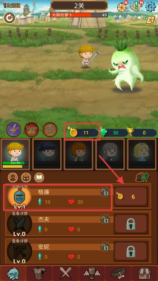 3、2关击败【大醉的萝卜】,用【11】金币升级【格廉】,提升战力备战后续。