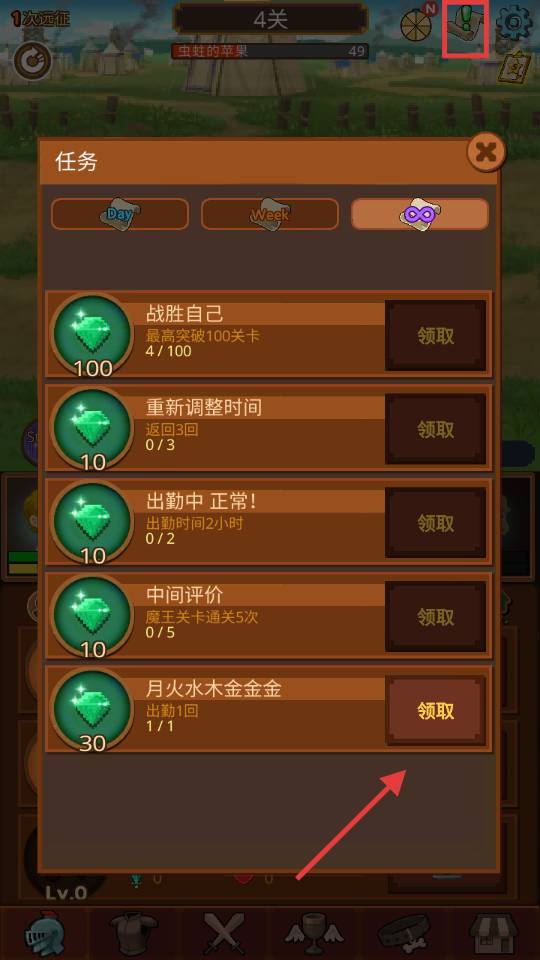 4、点击任务图标,完成的任务如【月火水木金金金】点击领取,积累钻石强化角色。
