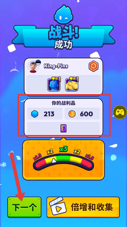 3、战斗成功后,领取【213-蓝晶】【600-金币】等战利品,点击【下一个】继续挑战。