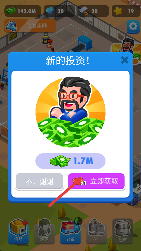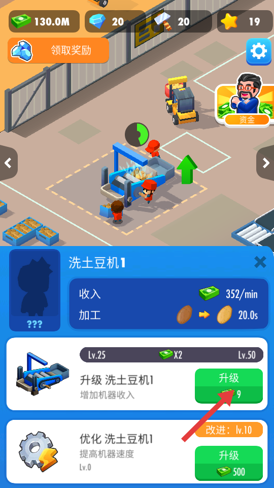 3、点击【升级】按钮,升级洗土豆机1,增加机器收入,提升生产效率。