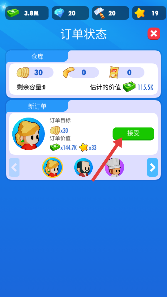2、在订单状态界面,点击【接受】按钮,接受订单目标为30份土豆片的订单。
