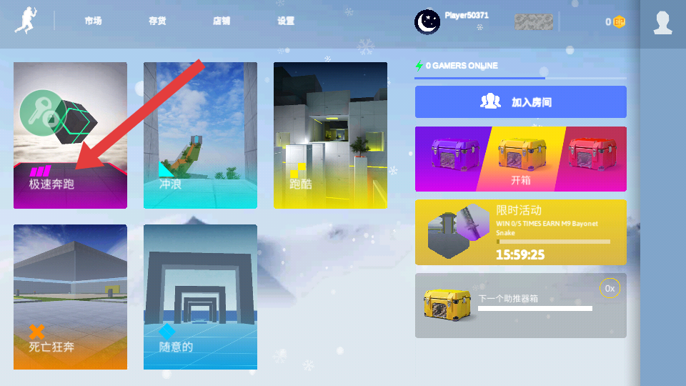 1、选择【极速奔跑】模式,进入对应的跳跃关卡,开启疯狂跳跃挑战。