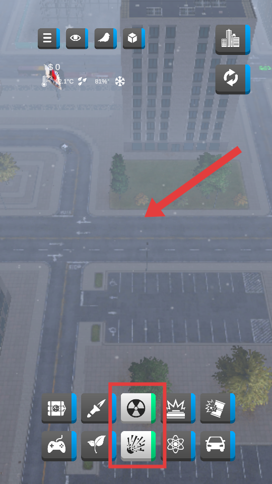 3、选择核辐射类破坏工具,瞄准城市中的建筑区域,发起破坏攻击。