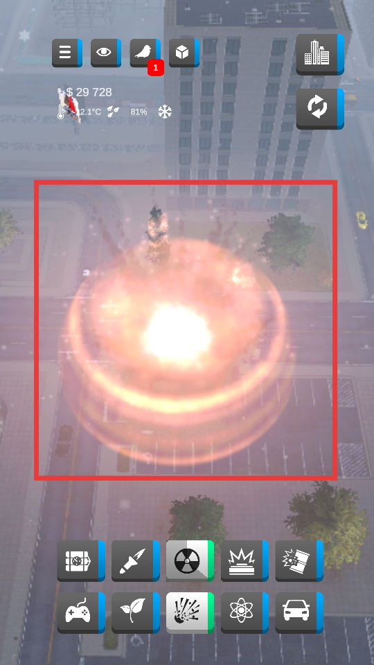 4、释放破坏工具后,可看到红框内的爆炸效果,持续破坏城市建筑,获取分数和资源。