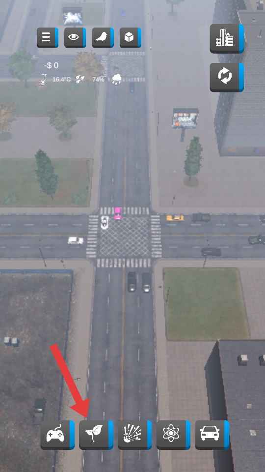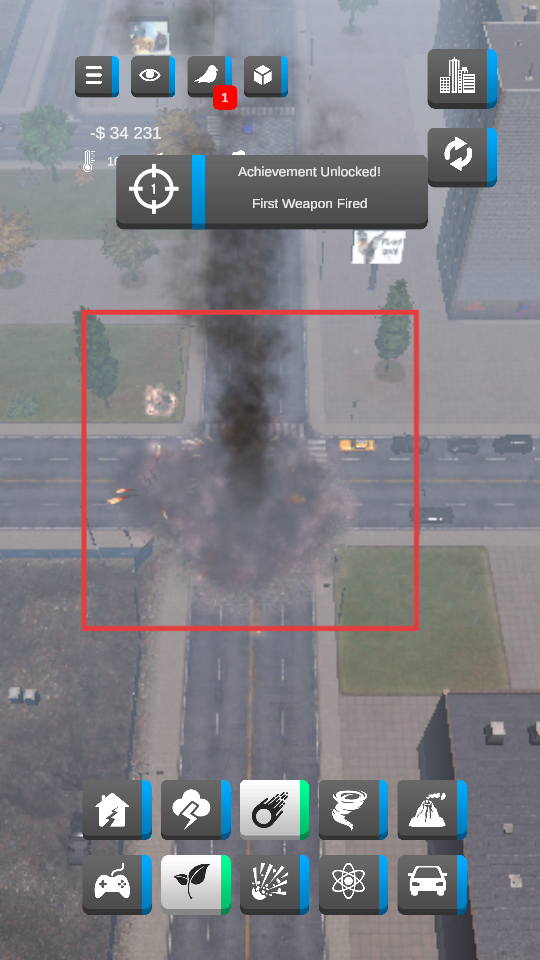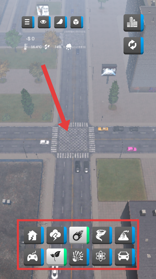 2、在游戏界面中,选择底部的自然类破坏工具,准备对城市区域发起自然破坏。