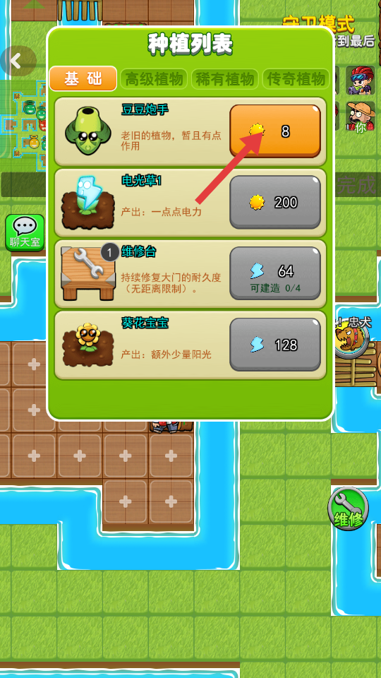 4、在种植列表中,花费【8】阳光购买豆豆炮手,布置该植物,助力击败怪物。