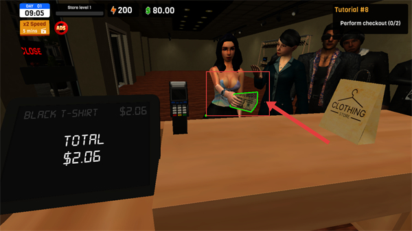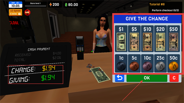 4、找零正确后完成结账,顾客离开,继续接待下一位顾客,推进店铺经营。