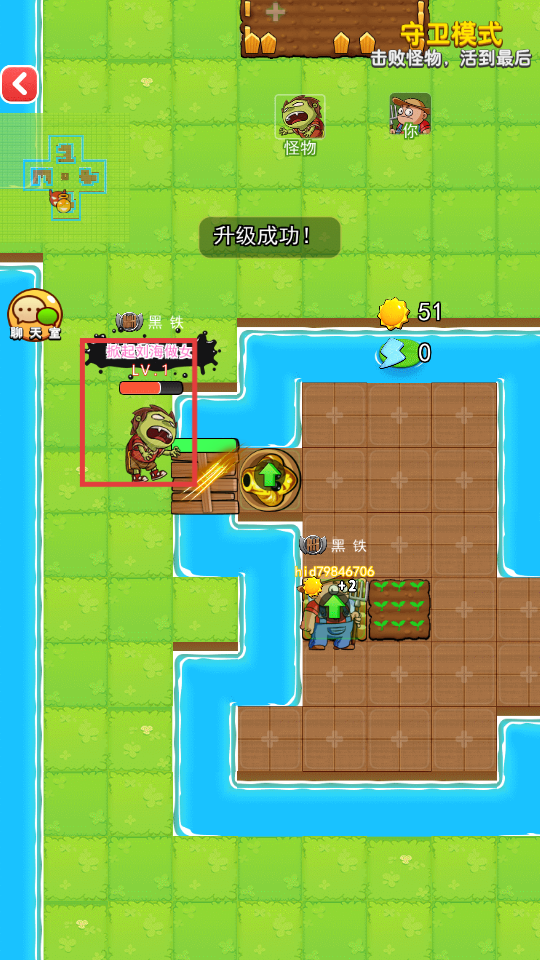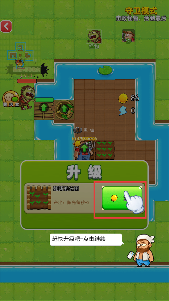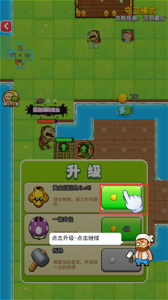 4、升级成功后,利用黄金豆豆炮击败怪物,推进游戏进程,完成守卫模式目标。