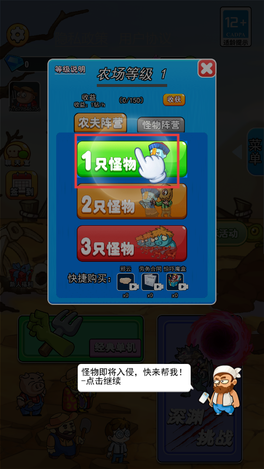 1、选择【1只怪物】的农夫阵营模式,开启守卫模式,击败怪物,活到最后。