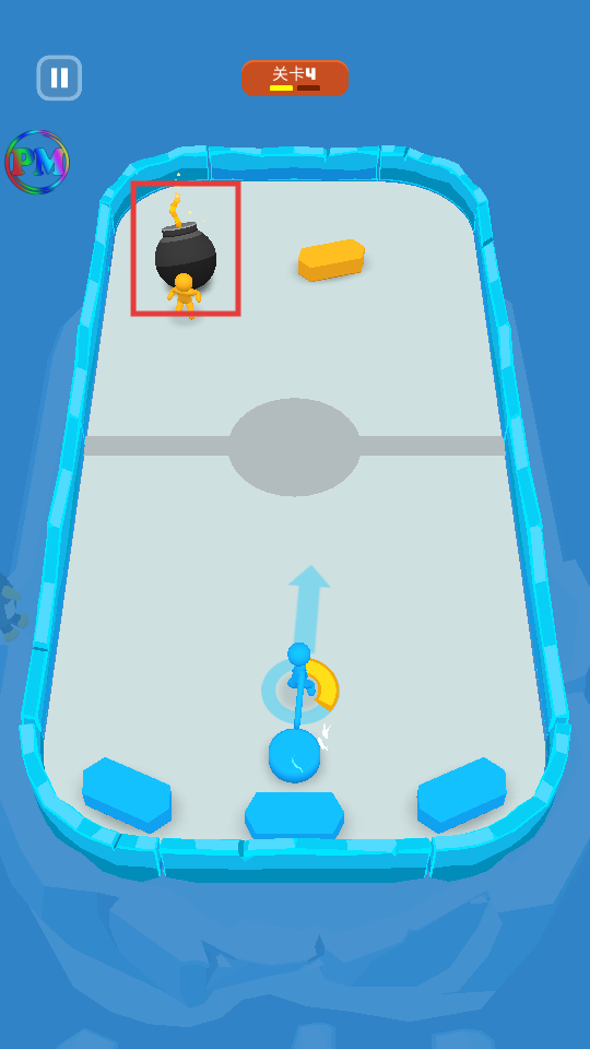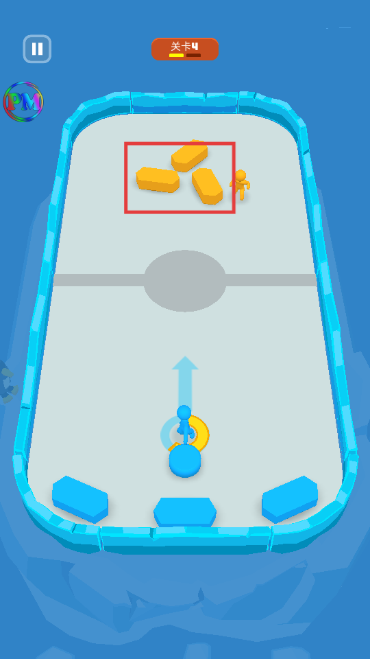 2、在关卡中,调整蓝色球体角度,准备向黄色障碍物和角色发起攻击。
