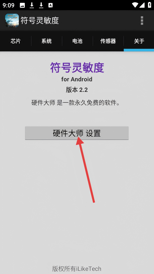 3、在【关于】页面,点击【硬件大师设置】按钮,可进入设置界面。