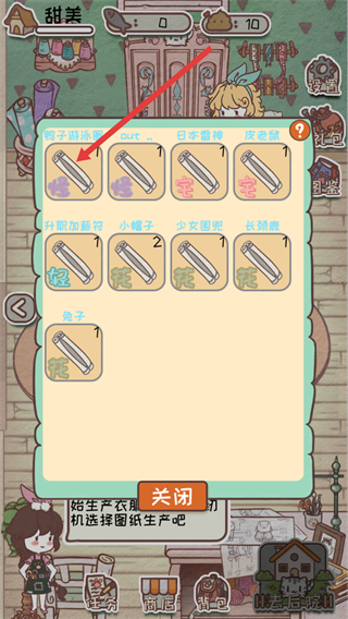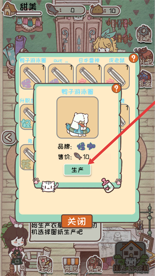 4、拥有图纸后,点击【生产】按钮,制作【花栗鼠】品牌【淑女】款猫咪衣服,售价10获取收益。