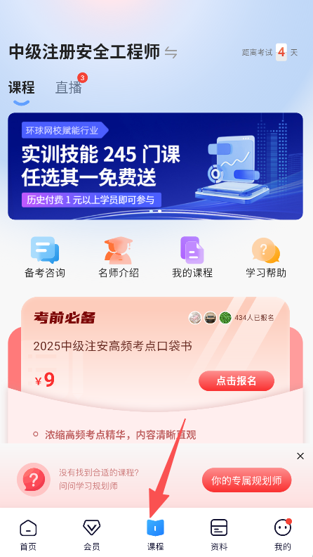 3、使用备考咨询服务,查看我的课程,获取学习资料,助力备考。