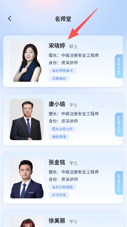 2、进入名师堂,了解宋晓婷等讲师的资质与授课风格。