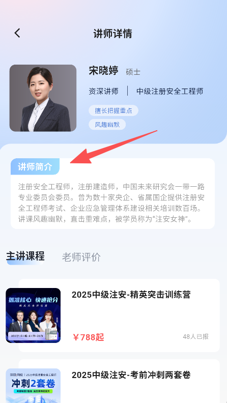2、名师介绍功能,展示宋晓婷等讲师的资质、授课风格,帮助考生了解讲师并选择适合的课程。