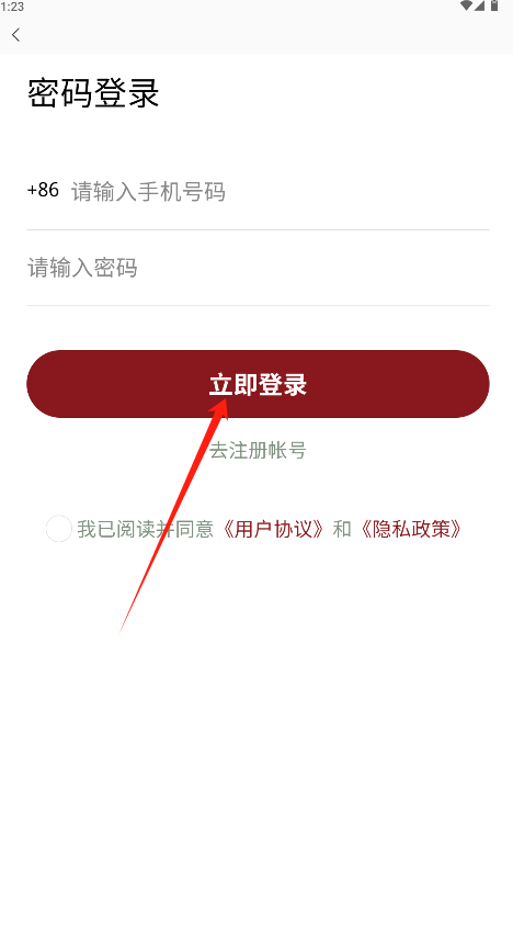 1、在应用登录界面输入手机号与密码后,勾选同意协议,点击“立即登录”进入。
