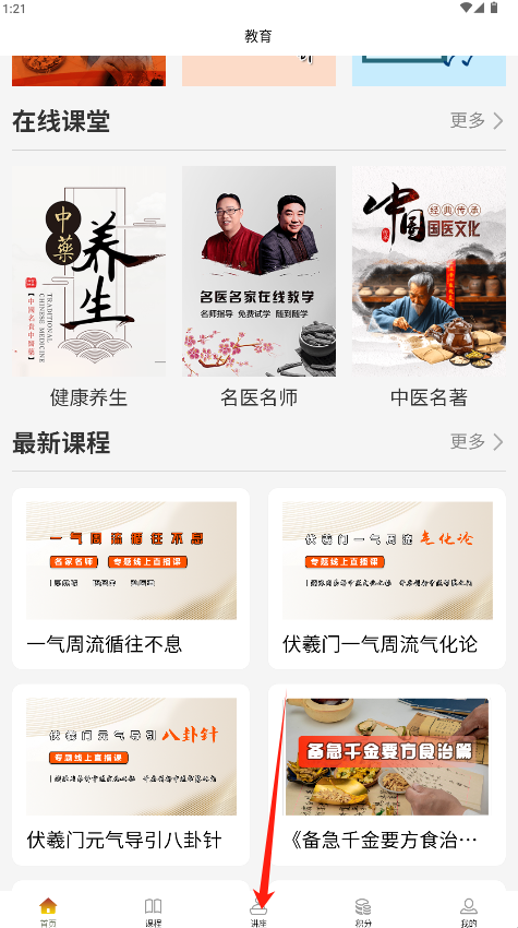 2、在底部导航栏点击“课堂”按钮,进入在线课堂页面浏览课程。