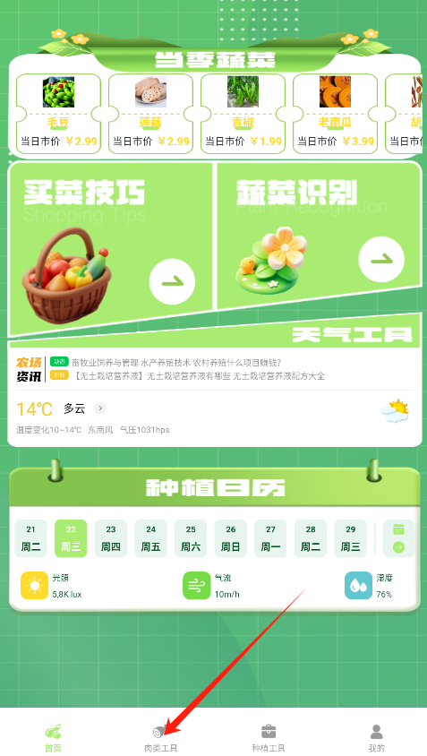 1、在首页底部导航栏点击“肉类工具”进入下一步。