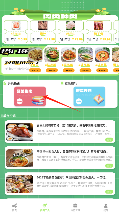 2、在应用首页浏览功能板块,点击“买菜指南”图标进入选购技巧页面。