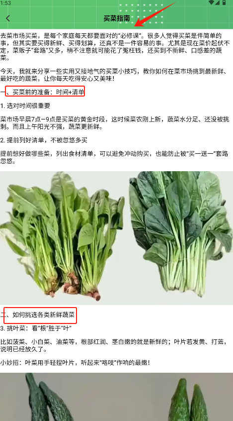 3、在指南页面阅读内容,学习挑选新鲜蔬菜的具体方法与实用小妙招。