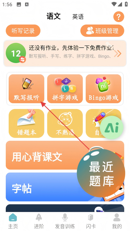 1、在语文板块,点击【默写报听】可进入默写练习功能区域。