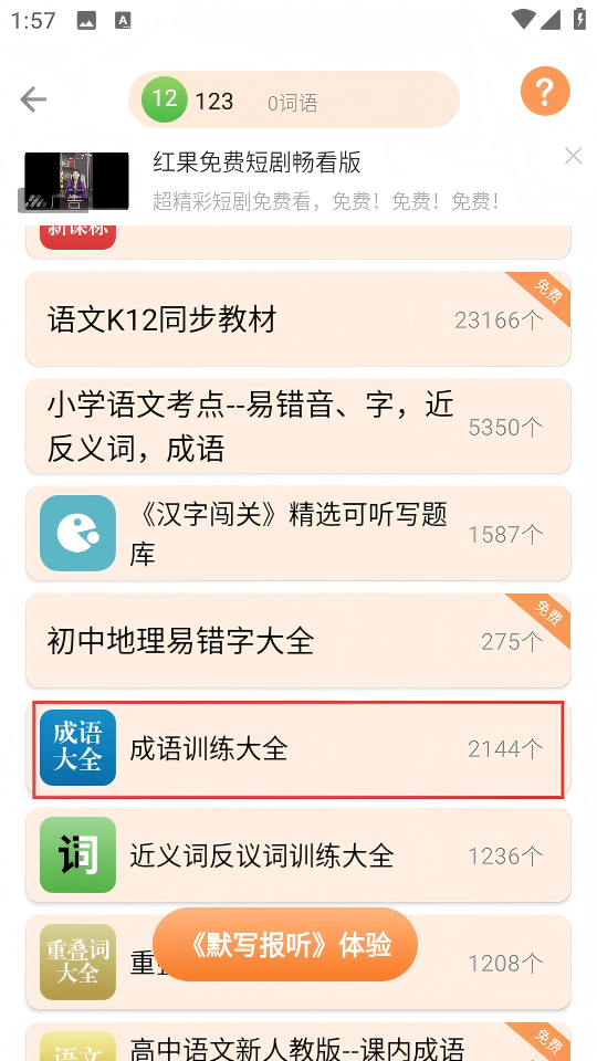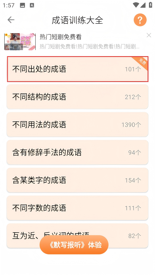 2、在题库列表页,点击【成语训练大全】可进入成语训练分类页面。