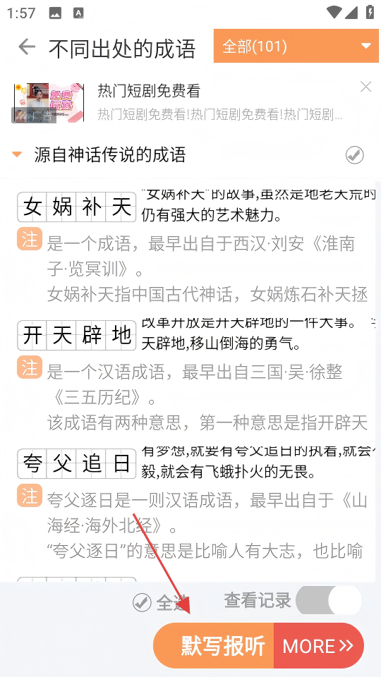 4、在不同出处的成语页面,点击【默写报听】可进行成语默写练习。