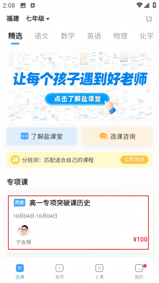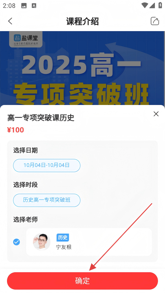 1、在选课页,点击【高一专项突破课历史】课程卡片,可进入该课程的介绍页面。