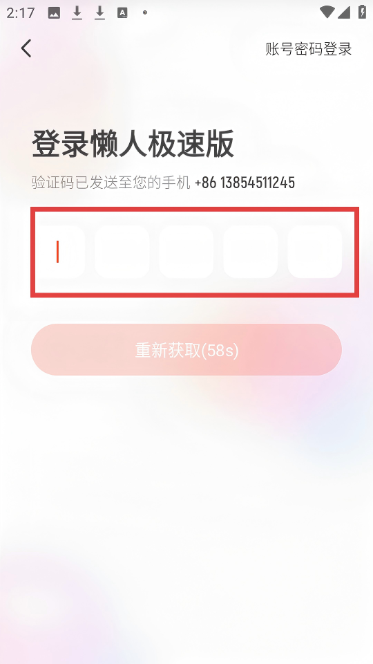 4、在【登录懒人极速版】界面输入验证码完成登录。