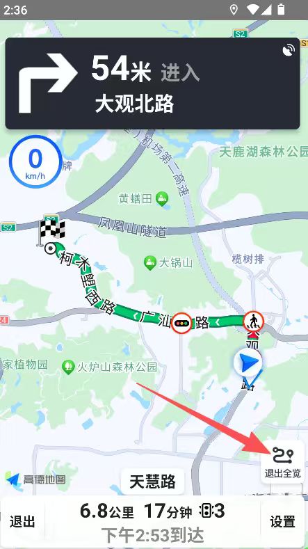 2、在导航中,可点击 “退出全览” 切换地图视图,查看路线细节。