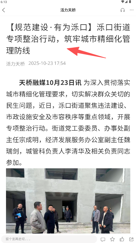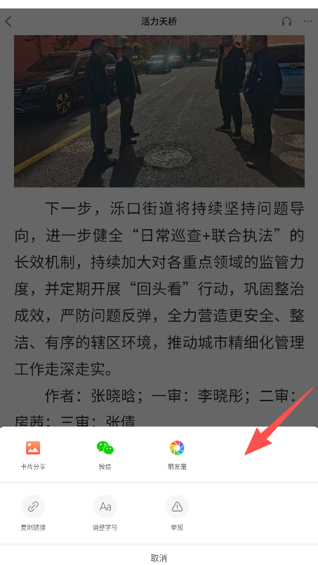 《活力天桥》是一款聚焦天桥区本地资讯的软件,设有街道、部门、清风、政法等多个板块,街道板块可查看如泺口街道等各街道的工作动态与整治行动等资讯。点击资讯可进入详情页,查看详细内容与配图,还可通过卡片分享、微信、朋友圈等方式分享资讯,助力本地居民及时了解天桥区各领域动态,掌握本地政务、民生等信息,便捷获取与分享本地资讯。