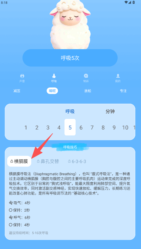2、选择呼吸技巧(如横膈膜),查看吸气、保持、呼气时长说明。