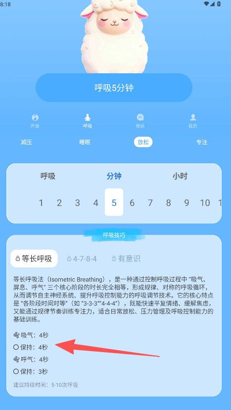 3、界面引导优,可爱小羊界面搭配清晰的吸气、呼气提示,让呼吸训练过程更具趣味性与指导性。