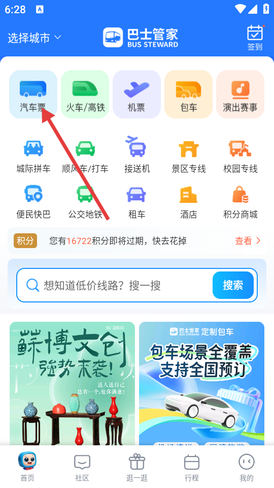 1、在巴士管家首页,点击【汽车票】选项,进入汽车票查询页面。
