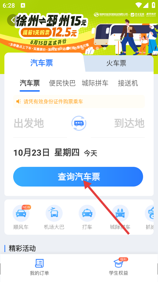 2、在汽车票查询页面,选择出发地、到达地和日期后,点击【查询汽车票】按钮,查看车票信息。