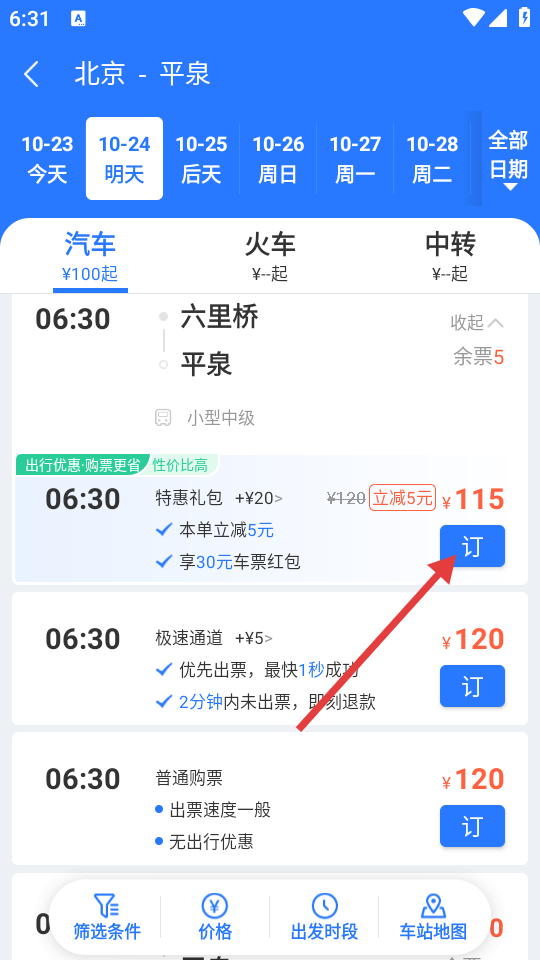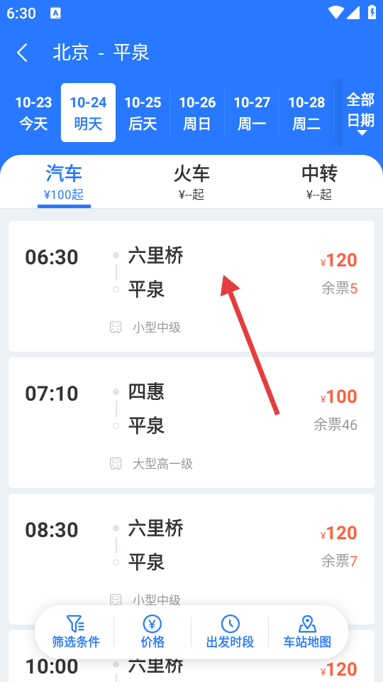 3、在车票信息页面,选择合适的班次,如06:30六里桥到平泉的班次,点击进入班次详情页面。
