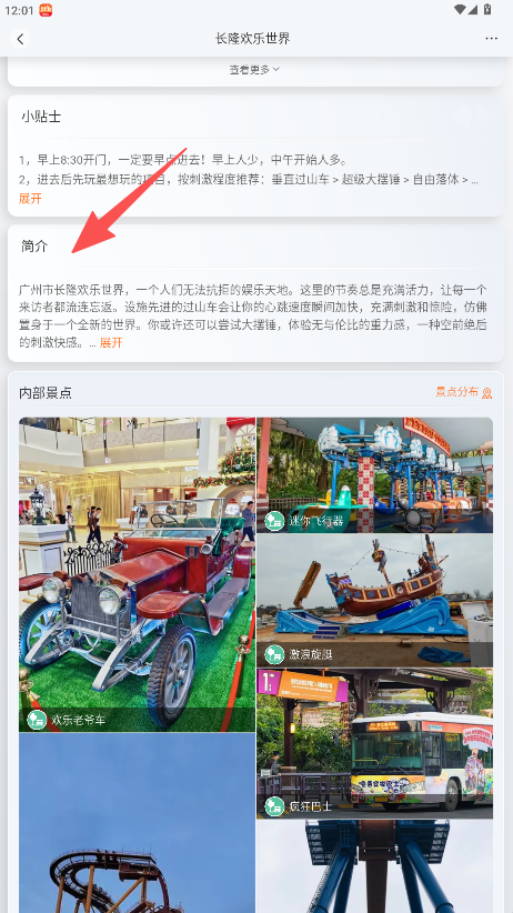 2、景点信息全,展示景点简介、内部景点等,如长隆欢乐世界的游乐项目介绍,信息传递详细。