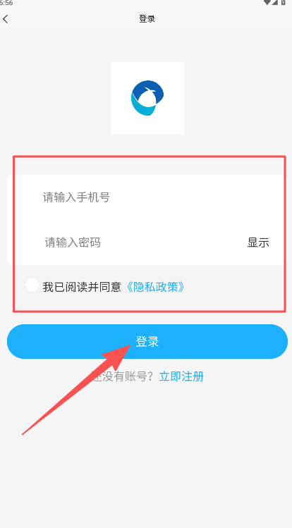 1、在登录界面输入手机号与密码,勾选同意隐私政策后点击“登录”。