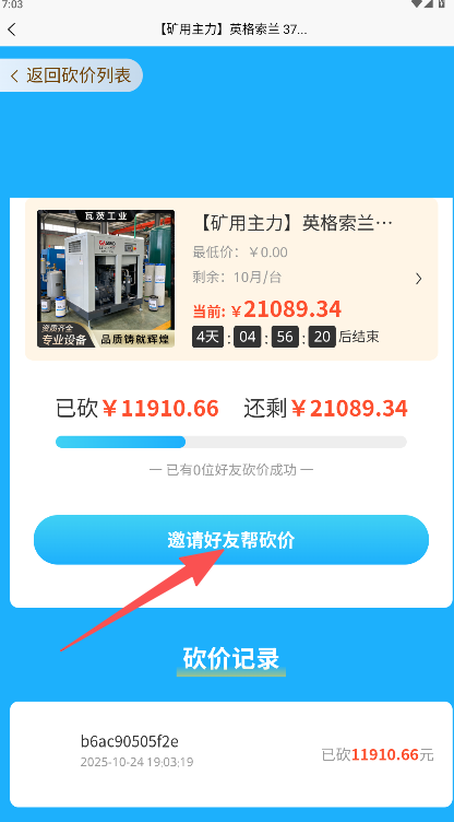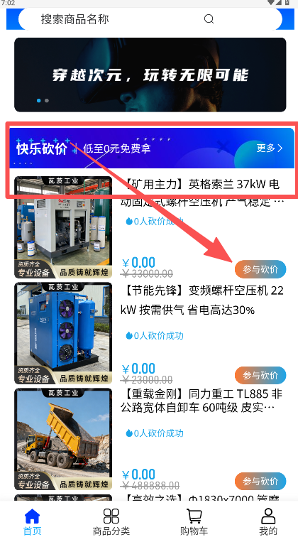 2、登录成功后进入首页,在“快乐砍价”专区选择目标商品如空压机点击“参与砍价”。