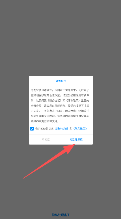 1、首次启动软件时,在温馨提示弹窗中阅读协议后,点击“同意并继续”。