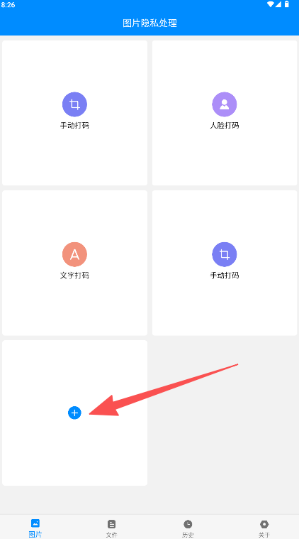2、进入主界面后选择图片功能,点击的带加号图标添加图片。